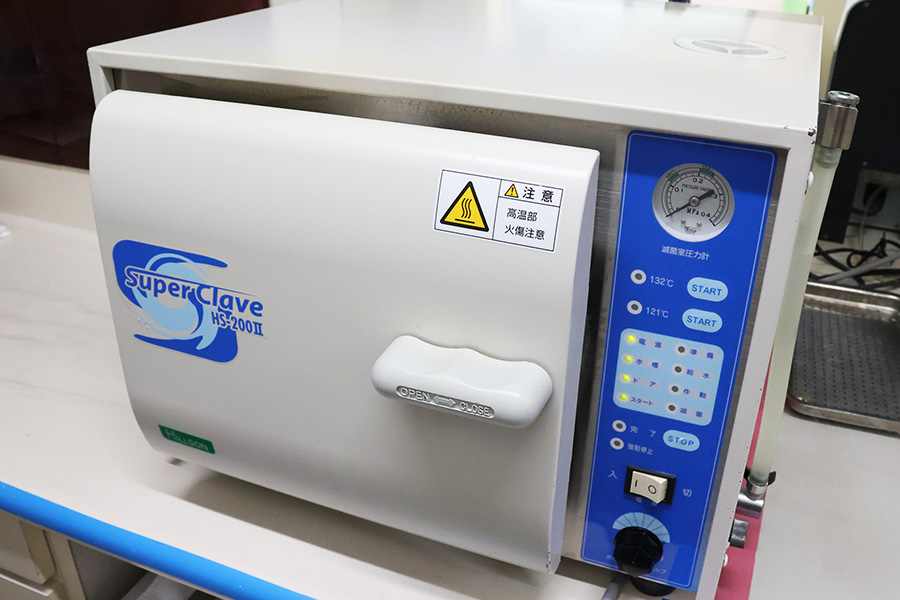 歯科治療では唾液・血液が器具に付着するため、滅菌の徹底がとても重要です。当院では優れた性能を備えた滅菌器を使用して、使用済の器具に処理を施しています。